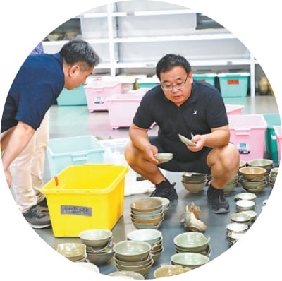 梁國慶(右)在整理出水文物。周瑩水?dāng)z