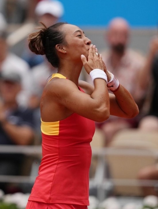8月3日,鄭欽文在奪冠后向觀(guān)眾致意。 當(dāng)日,在巴黎奧運(yùn)會(huì)網(wǎng)球女子單打金牌賽中,中國(guó)選手鄭欽文2比0戰(zhàn)勝克羅地亞選手維基奇,奪得金牌。 新華社記者 萬(wàn)象 攝