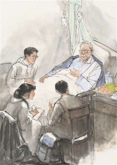 人民教師勤學(xué)篤行、求是創(chuàng)新的躬耕態(tài)度,給無數(shù)人以榜樣的力量,也給美術(shù)創(chuàng)作以靈感。“人民教育家”國家榮譽(yù)稱號(hào)獲得者衛(wèi)興華,終其一生都奮斗在勤學(xué)求真的道路上。90余歲時(shí),即使病痛纏身,他仍堅(jiān)持每天學(xué)習(xí)、工作。有感于衛(wèi)興華教授的敬業(yè)精神,高毅特意描繪了臥病在床的衛(wèi)興華堅(jiān)持與學(xué)生探討學(xué)術(shù)課題的場景,主人公那專注的神情令人動(dòng)容。像衛(wèi)興華這樣堅(jiān)守耕耘的教師還有許多。劉昌明水彩畫《一個(gè)教師的工作臺(tái)》便以細(xì)致的場景描繪表達(dá)出對教師群體的敬意。貼著泛黃舊紙的墻面、藥瓶和墨水瓶之間的教案、脫漆的木桌、一副老花眼鏡……畫家在此調(diào)動(dòng)了一切能夠反映老一輩教育者辛勤伏案的元素,象征著沒有直接出場的教師形象。“此處無聲勝有聲”的表達(dá)效果,令人回味無窮。