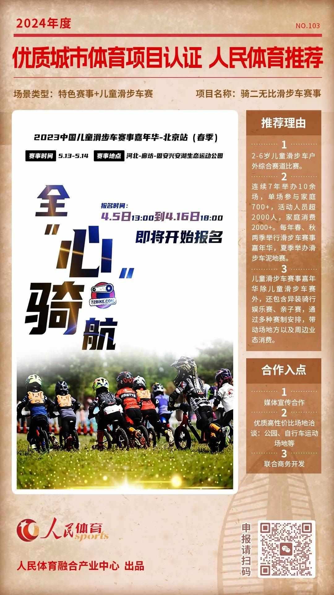 “優(yōu)質(zhì)體育賽事及活動認(rèn)證推薦計(jì)劃”是人民體育“城市體育產(chǎn)業(yè)高質(zhì)量發(fā)展計(jì)劃”的重要組成部分,人民體育一直致力于攜手權(quán)威機(jī)構(gòu)、組織單位等聯(lián)合推薦優(yōu)質(zhì)項(xiàng)目,項(xiàng)目類型包括且不限于賽事、活動,也涵蓋產(chǎn)品與服務(wù)類別。旨在以更客觀的角度,展示在體育產(chǎn)業(yè)發(fā)展中有所創(chuàng)新,有所價值的項(xiàng)目,促進(jìn)多方相互了解,融合發(fā)展。