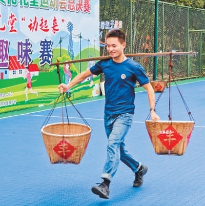 在白沙村舉辦的浙江省農(nóng)村文化禮堂運動會總決賽上,村民參與挑扁擔比賽。