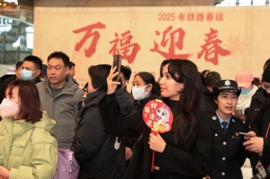 2025年鐵路春運(yùn)“萬福迎春”活動現(xiàn)場,一位外籍旅客自拍留念。