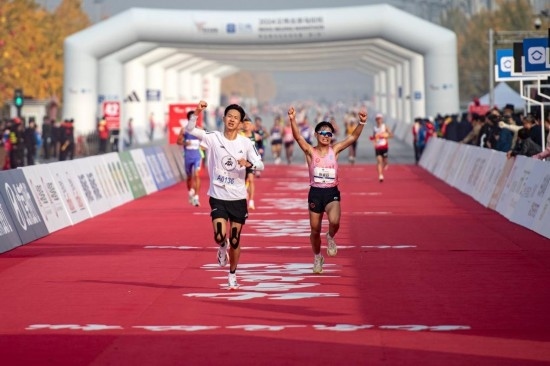 2024年11月3日,2024北京馬拉松賽暨全國馬拉松錦標(biāo)賽(第3站)在京舉行。參賽選手沖向位于奧林匹克公園的終點(diǎn)線。新華社記者 陳鐘昊攝