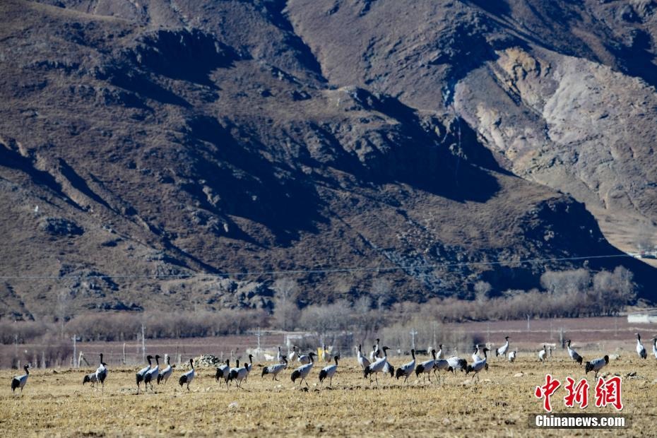 12月20日,黑頸鶴在西藏拉薩市林周縣虎頭山水庫(kù)周邊的冬灌地里棲息。嚴(yán)冬時(shí)節(jié),拉薩河谷沿線的草甸、山巒、候鳥、寺廟構(gòu)成一道獨(dú)特的風(fēng)景線。 中新社記者 貢嘎來(lái)松 攝