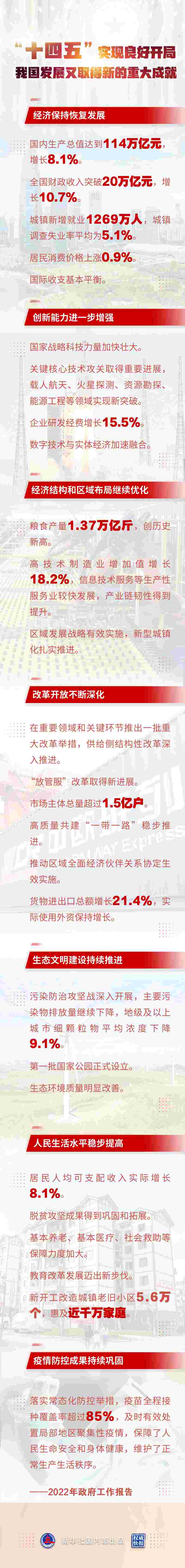 ——人民生活水平穩(wěn)步提高。居民人均可支配收入實際增長8.1%。脫貧攻堅成果得到鞏固和拓展?;攫B(yǎng)老、基本醫(yī)療、社會救助等保障力度加大。教育改革發(fā)展邁出新步伐。新開工改造城鎮(zhèn)老舊小區(qū)5.6萬個,惠及近千萬家庭。