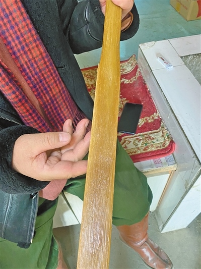 “用彈性很好的竹子或木頭作為弓胎,制作弓里的牛角一般是水牛角,或者巖羊角也可以,貼在弓外的牛筋來自春天的牛,這時候牛比較瘦,牛筋油脂少、有彈性。膠則是用魚膘、魚皮、豬皮、馬皮等熬制的膘膠,最外面還要貼一層蛇皮或者樺樹皮,防止受潮。”諾敏朝魯說。