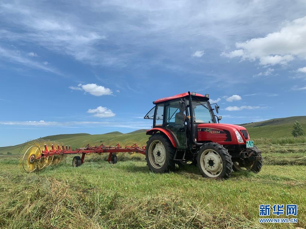 立秋過后,內(nèi)蒙古興安盟牧民駕駛機械開始打草工作,為牛羊過冬儲備草料。此次秋季打草將持續(xù)至9月中旬。今夏,興安盟草原雨水豐沛,加之禁牧工作有效落實,草原產(chǎn)草量較往年有所增加。新華社記者王靖攝